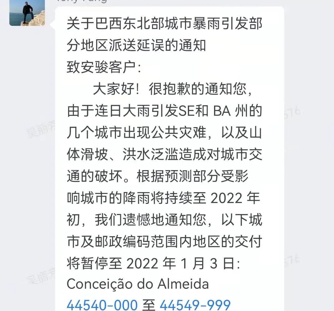 面對巴西大面積的強降雨,安駿物流提前向客戶發出了物流可能延誤的預警通知。