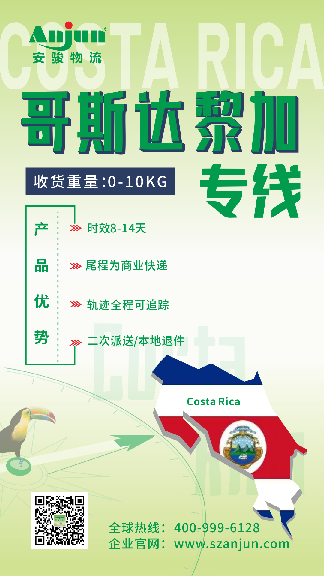 安駿物流有效地整合多方強(qiáng)勢(shì)資源,強(qiáng)勢(shì)推出“中國(guó)–哥斯達(dá)黎加”跨境電商空運(yùn)小包產(chǎn)品,主要產(chǎn)品優(yōu)勢(shì)有: